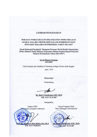 Uswanas, Su’ud Banun (2019) Peranan World Health Organization (Who) Melalui Global Malaria Programme Dalam Pemberantasan Penyakit Malaria Di Indonesia Tahun 2013-2017. Other thesis, Universitas Komputer Indonesia.