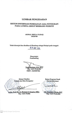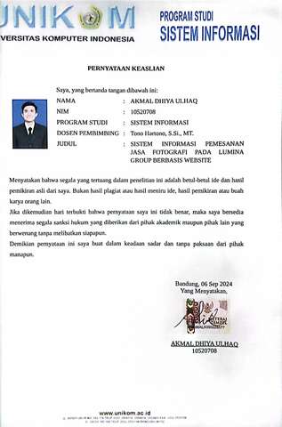 Ulhaq, Akmal Dhiya (2024) Sistem Informasi Pemesanan Jasa Fotografi Pada Lumina Group Berbasis Website. Other thesis, Universitas Komputer Indonesia.