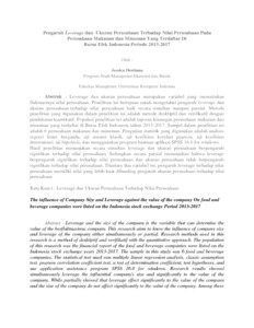 Leverage dan ukuran perusahaan merupakan variabel yang dapat menentukan berfluktuasinya nilai perusahaan. Penelitian ini bertujuan untuk mengetahui pengaruh leverage dan ukuran perusahaan terhadap nilai perusahaan baik secara simultan maupun parsial. Metode penelitian yang digunakan dalam penelitian ini adalah metode desktiptif dan verifikatif dengan pendekatan kuantitatif. Populasi penelitian ini adalah laporan keuangan perusahaan makanan dan minuman yang terdaftar di Bursa Efek Indonesia tahun 2013-2017. Sampel dalam penelitian ini adalah 6 perusahaan makanan dan minuman. Pengujian statistik yang digunakan adalah analisis regresi linier berganda, uji asumsi klasik, uji koefisien korelasi pearson, uji koefisien determinasi, uji hipotesis, dan menggunakan program bantuan aplikasi SPSS 16.0 for windows. Hasil penelitian menunjukan secara simultan leverage dan ukuran perusahaan berpengaruh signifikan terhadap nilai perusahaan. Sedangkan secara parsial menunjukan bahwa leverage berpengaruh signifikan terhadap nilai perusahaan dan ukuran perusahaan tidak berpengaruh signifikan terhadap nilai perusahaan. Diantara dua variabel ini, pengaruh leverage terhadap nilai perusahaan memiliki nilai yang lebih kuat dibanding pengaruh ukuran perusahaan terhadap nilai perusahaan