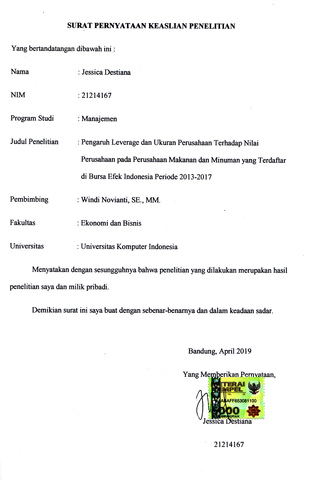 Destiana, Jessica (2019) Pengaruh Leverage dan Ukuran Perusahaan Terhadap Nilai Perusahaan Pada Perusahaan Makanan dan Minuman Yang Terdaftar Di Bursa Efek Indonesia Periode 2013-2017. Other thesis, Universitas Komputer Indonesia.