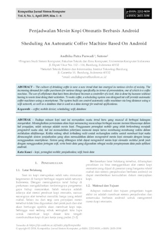 Budaya minum kopi saat ini merupakan suatu trend baru yang muncul diberbagai kalangan masyarakat. Meningkatnya permintaan akan kopi memancing munculnya berbagai macam inovasi khususnya dalam hal penyajian, salah satunya adalah mesin kopi. Penggunaan perangkat mobile yang telah berkembang menjadi pengontrol suatu alat, hal ini memudahkan pekerjaan manusia tanpa harus membuang-buang waktu dalam melakukan aktifitasnya. Ketika sedang sibuk terkadang sulit untuk meluangkan waktu untuk membuat kopi maka dirancanglah sistem penjadwalan yang akan memudahkan dalam mengontrol mesin kopi otomatis dengan hanya menggunakan smartphone. Sistem yang dibangun telah dapat mengontrol mesin kopi otomatis melalui jarak jauh dengan menggunakan jaringan Wifi, serta basis data yang digunakan sebagai media penyimpanan data pada aplikasi Android.