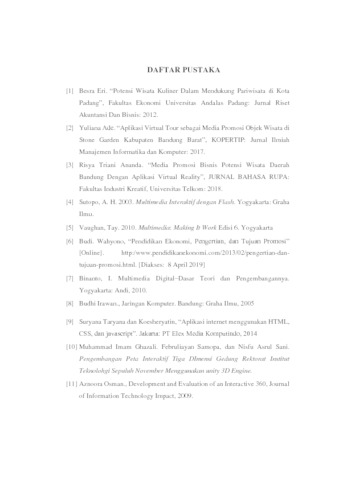 | Uncontrolled Keywords: | Virtual Map, Virtual Tour, Wista Kuliner, Disparbud Bandung Barat, Dinas UMKM Bandung Barat, Media Promosi, Potensi daerah. |