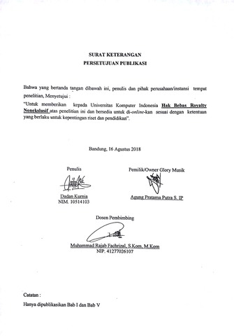 Kurnia, Dadan (2018) Perancangan Sistem Informasi Pengelolaan Glory Musik Studio Berbasis Web. Other thesis, Universitas Komputer Indonesia.