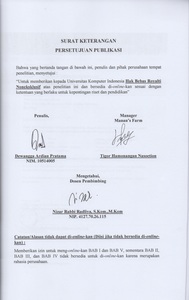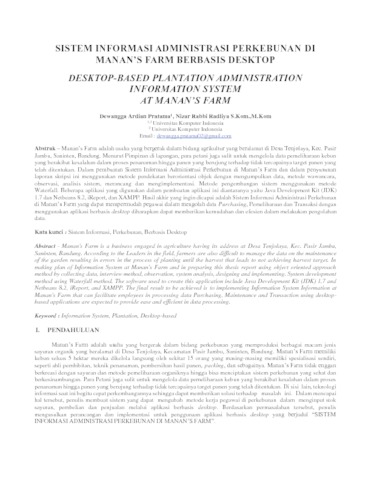 Manan’s Farm adalah usaha yang bergerak dalam bidang agrikultur yang beralamat di Desa Tenjolaya, Kec. Pasir Jambu, Saninten, Bandung. Manan’s Farm memiliki kebun seluas 5 hektar mereka dikelola oleh orang yang berpengalaman di bidangnya masing-masing. Selama ini, prosedur pencatatan dan perekapan data dirasa tidak maksimal karena masih menggunakan media buku laporan dan bantuan aplikasi Microsoft Excel. Menurut Pimpinan di lapangan, para petani juga sulit untuk mengelola data pemeliharaan kebun yang berakibat kesalahan dalam proses penanaman hingga panen yang berujung terhadap tidak tercapainya target panen yang telah ditentukan.Dalam pembuatan Sistem Informasi Administrasi Perkebunan di Manan’s Farm dan dalam penyusunan laporan skripsi ini menggunakan metode pendekatan berorientasi objek dengan mengumpulkan data, metode wawancara, observasi, analisis sistem, merancang dan mengimplementasi. Metode pengembangan sistem menggunakan metode Waterfall. Perangkat lunak yang digunakan untuk membuat aplikasi ini diantaranya Java Development Kit (JDK) 1.7 dan Netbeans 8.2, iReport, dan XAMPP.Hasil akhir yang ingin dicapai adalah Sistem Informasi Administrasi Perkebunan di Manan’s Farm yang dapat mempermudah pegawai dalam mengolah data Purchasing, Pemeliharaan dan Transaksi dengan menggunakan aplikasi berbasis desktop diharapkan dapat memberikan kemudahan dan efesien dalam melakukan pengolahan data.