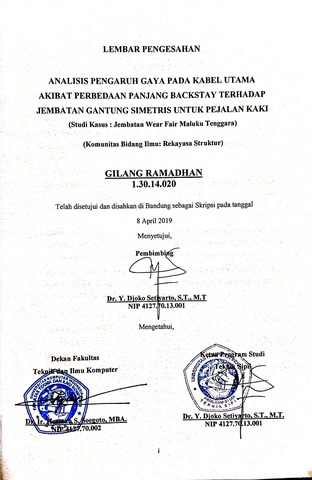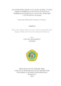 Ramadhan, Gilang (2019) Analisis Pengaruh Gaya Pada Kabel Utama Akibat Perbedaan Panjang Backstay Terhadap Jembatan Gantung Simetris Untuk Pejalan Kaki. Other thesis, Universitas Komputer Indonesia.