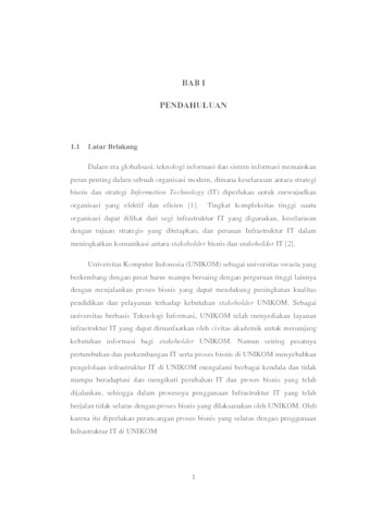 Universitas adalah lembaga yang wajib berkontribusi dalam pendidikan tinggi, penelitian, dan pengabdian kepada masyarakat yang dikenal sebagai Tri Dharma Perguruan Tinggi. Universitas juga memiliki hak untuk mengelola lembaga mereka. Dalam meningkatkan proses bisnis berdasarkan Tri Dharma Perguruan Tinggi, Universitas yang berbasis pada teknologi informasi (IT) harus melakukan perencanaan terhadap blueprint IT untuk mendukung proses penyelarasan antara strategi IT dan strategi bisnis organisasi. Universitas Komputer Indonesia (UNIKOM) sebagai universitas swasta di Kota Bandung, sudah mengimplementasikan infrastruktur IT dan dikelola oleh divisi yang sesuai. Akan tetapi, manajemen IT di Unikom yang lebih rumit dan terpisah dari manajemen IT menyebabkan Infrastruktur IT tidak mampu beradaptasi dan menanggapi pesatnya perubahan pada kebutuhan bisnis.