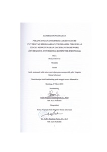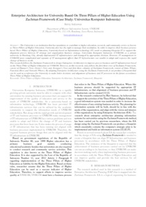 Tesis ini dibangun menggunakan Zachman Framework yang bertujuan untuk merancang Enterprises Architecture agar dapat meningkatkan proses bisnis dan Infrastruktur IT berdasarkan Tri Dharma Perguruan Tinggi di UNIKOM. Namun dalam tesis ini hanya menggikuti tiga baris pertama pada Zachman Framework yang terdiri dari Planner's View, Owner's View, dan Designer's View serta tiga kolom pertama pada Zachman Framework yang terdiri dari kolom Data (What), Function (How) dan Network (Where). Dengan mengadopsi Enterprise Architecture menggunakan Zachman Framework, dapat menghasilkan blueprint yang dapat dijadikan acuan bagi Universitas untuk melakukan pengambilan keputusan yang lebih baik dan menyelaraskan proses bisnis dan IT di masa mendatang yang sesuai dengan Tri Dharma Perguruan Tinggi.
