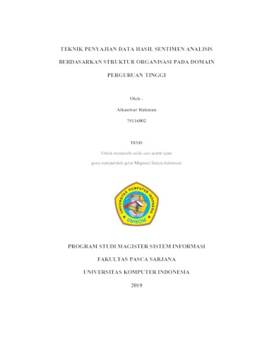 Alkautsar, Rahman (2019) Teknik Penyajian Data Hasil Sentimen Analisis Berdasarkan Struktur Organisasi Pada Domain Perguruan Tinggi. Masters thesis, Universitas Komputer Indonesia.