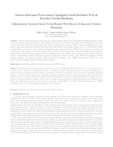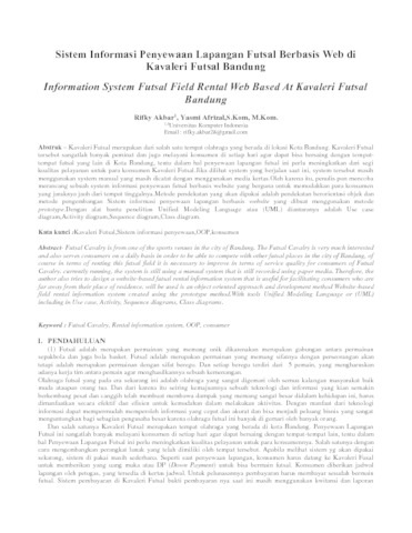 Kavaleri Futsal merupakan salah satu tempat olahraga yang berada di lokasi Kota Bandung. Kavaleri Futsal tersebut sangatlah banyak peminat dan juga melayani konsumen di setiap hari agar dapat bisa bersaing dengan tempat-tempat futsal yang lain di Kota Bandung, tentu dalam hal penyewaan lapangan futsal ini perlu meningkatkan dari segi kualitas pelayanan untuk para konsumen Kavaleri Futsal.Jika dilihat system yang berjalan saat ini, system tersebut masih menggunakan system manual yang masih dicatat dengan menggunakan media kertas.Oleh karena itu, penulis pun mencoba merancang sebuah system informasi penyewaan futsal berbasis website yang berguna untuk memudahkan para konsumen yang jaraknya jauh dari tempat tinggalnya.Metode penelitian yang digunakan pada penelitian di Kavaleri Futsal adalah metode deskriptif yaitu dengan gambaran tentang penelitian selanjutnya yang akan diambil tindakan untuk membuat sebuah system informasi penyewaan lapangan.