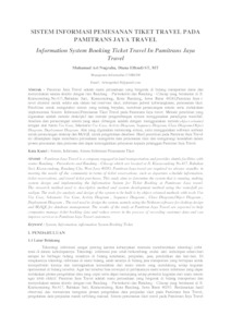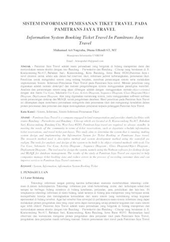 Pamitran Jaya Travel adalah suatu perusahaan yang bergerak di bidang transportasi darat dan menyediakan sarana shuttle dengan rute Bandung – Purwokerto dan Bandung - Cilacap yang beralamat di Jl. Kiaracondong No.417,Babakan Sari, Kiaracondong, Kota Bandung, Jawa Barat 40283,Pamitran Jaya travel dituntut untuk selalu ada dalam hal reservasi tiket, informasi jadwal keberangkatan, pemesanan tiket. Penelitian untuk mengetahui sistem yang sedang berjalan, membuat perancangan sistem serta melakukan implementasi Sistem Informasi Pemesanan Tiket Travel pada Pamitrans Jaya travel. Metode penelitian yang digunakan adalah metode deskriptif dan metode pengembangan system menggunakan paradigma waterfall. Analisis dan perancangan sistem yang akan di bangun adalah dengan menggunakan metode object oriented dengan alat bantu Use Case, Sekenario Use Case, Activty Diagram, Sequence Diagram, Class Diagram,Object Diagram, Deployment Diagram. Alat yang digunakan merancang sistem, yaitu menggunakan software netbean untuk perancangan desktop dan MySQL untuk pengelolaan database. Hasil penelitian pada Pamitran Jaya Travel ini diharapkan dapat membantu perusahaan mengelola data pemesanan tiket dan mengurangi kesalahan dalam proses pencatatan data pemesan dan dapat meningkatkan pelayanan kepada pelanggan Pamitran Jaya Travel