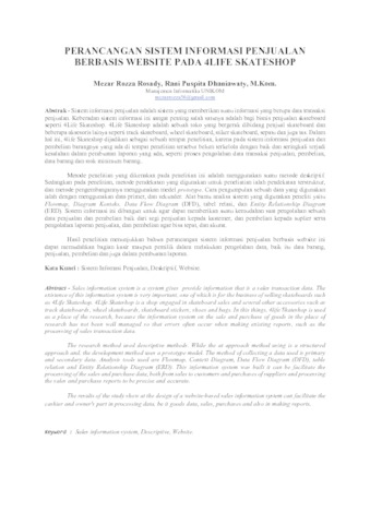 Sistem informasi penjualan adalah sistem yang memberikan suatu informasi yang berupa data transaksi penjualan. Keberadan sistem informasi ini sangat penting salah satunya adalah bagi bisnis penjualan skateboard seperti 4Life Skateshop. 4Life Skateshop adalah sebuah toko yang bergerak dibidang penjual skateboard dan beberapa aksesoris lainya seperti track skateboard, wheel skateboard, stiker skateboard, sepatu dan juga tas. Dalam hal ini, 4life Skateshop dijadikan sebagai sebuah tempat penelitian, karena pada sistem informasi penjualan dan pembelian barangnya yang ada di tempat penelitian tersebut belum terkelola dengan baik dan seringkali terjadi kesalahan dalam pembuatan laporan yang ada, seperti proses pengolahan data transaksi penjualan, pembelian, data barang dan stok minimum barang. Metode penelitian yang dikenakan pada penelitian ini adalah menggunakan suatu metode deskriptif. Sedangkan pada penelitian, metode pendekatan yang digunakan untuk peneliatian ialah pendekatan terstruktur, dan metode pengembangannya menggunakan medel prototype. Cara pengumpulan sebuah data yang digunakan ialah dengan menggunakan data primer, dan sekunder. Alat bantu analisa sistem yang digunakan peneliti yaitu Flowmap, Diagram Konteks, DataaFlowaDiagram (DFD), tabel relasi, dan EntityaRelationshipaDiagram (ERD). Sistem informasi ini dibangun untuk agar dapat memberikan suatu kemudahan saat pengolahan sebuah data penjualan dan pembelian baik dari segi penjualan kepada kastemer, dan pembelian kepada suplier serta pengolahan laporan penjualan, dan pembelian agar bisa tepat, dan akurat. Hasilapenelitianamenunjukkan bahwa perancangan sistem informasi penjualan berbasis website ini dapat memudahkan bagian kasir maupun pemilik dalam melakukan pengolahan data, baik itu data barang, penjualan, pembelian dan juga dalam pembuatan laporan.