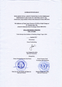 Tujuan penelitian ini adalah untuk mengetahui Total Assets Turnover (TATO) pada PT. Mustika Ratu serta perkembangannya pada periode 2008-2015. Dan untuk mengetahui besarnya pengaruh Total Assets Turnover (TATO) terhadap Perubahan laba pada PT. Mustika Ratu dalam menghitung Total Assets Turnover (TATO) dibutuhkan neraca laporan keuangan yang menunjukkan penjualan dan total aset, sedangkan dalam menghitung perubahan laba dibutuhkan penjualan dikurangi dengan harga pokok penjualan, beban usaha, beban dan bunga lainnya. Metode yang digunakan pada penelitian ini adalah metode deskfiptif dan verifikatif dengan pendekatan kuantitatif. Untuk mengetahui pengaruh Total Assets Turnover (TATO) terhadap perubahan laba, digunakan pengujian statistik dengan menggunakan SPSS 17.0 for windows. Hasil penelitian menunjukan bahwa dengan menggunakan analisis korelasi dan determinasi bahwa ada pengaruh antara Total Assets Turnover (TATO) terhadap perubahan laba tetapi pada pengujiannya tersebut terlihat bahwa pada kolom signifikan konstanta dan koefisien masing-masing adalah (0,282 > 0,05) dan (0,131 > 0,05) maka H0 diterima atau Total Assets Turnover (TATO) berpengaruh positif tidak signifikan terhadap perubahan laba pada PT. Mustika Ratu Tbk tahun periode 2008-2015.