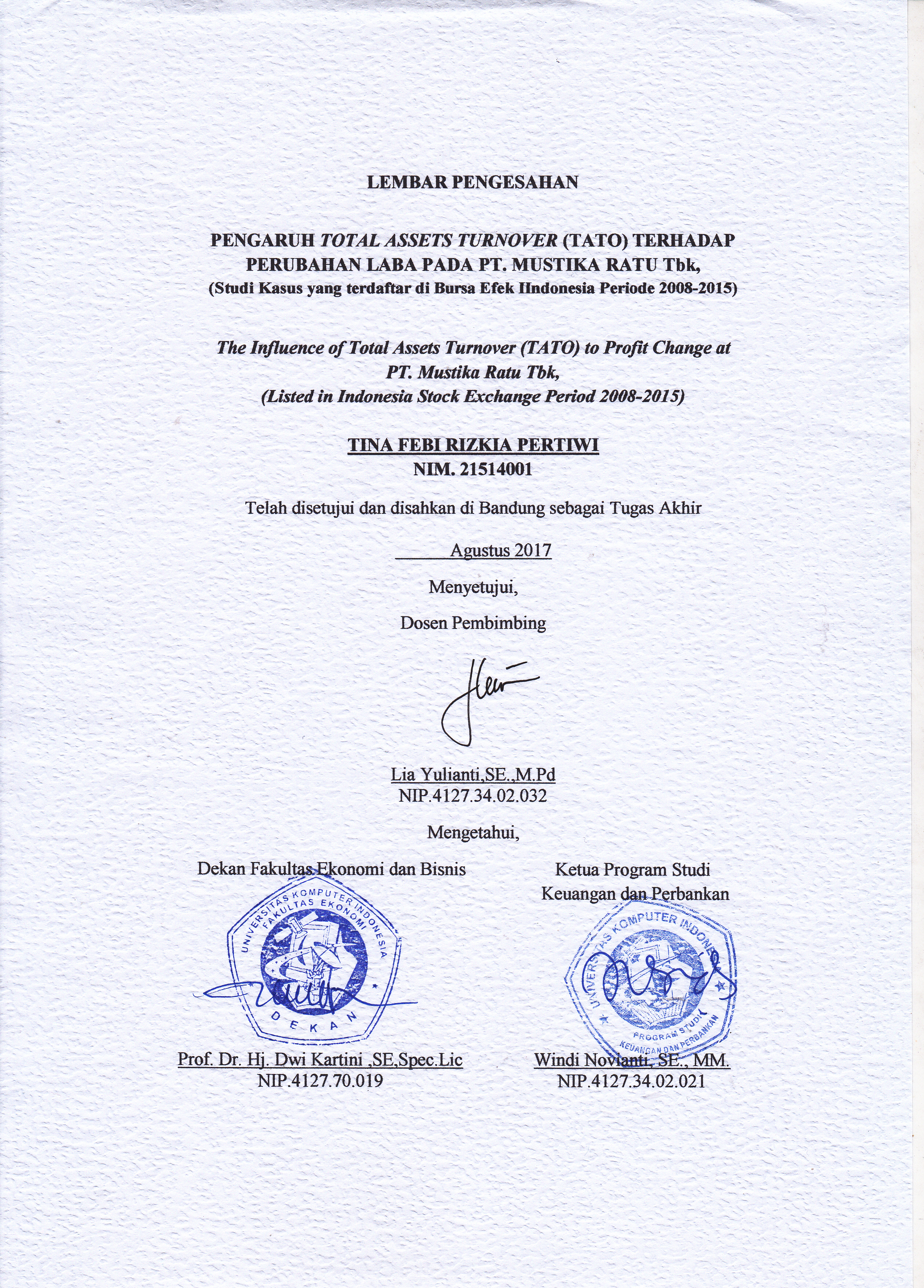 Tina Febi Rizkia Pertiwi NIM. 21514001 (2017) Pengaruh Total Assets Turnover (TATO) Terhadap Perubahan Laba Pada PT. MUstika Ratu Tbk, (Studi Kasus Yang Terdaftar di Bursa Efek Indonesia Periode 2008-2015).