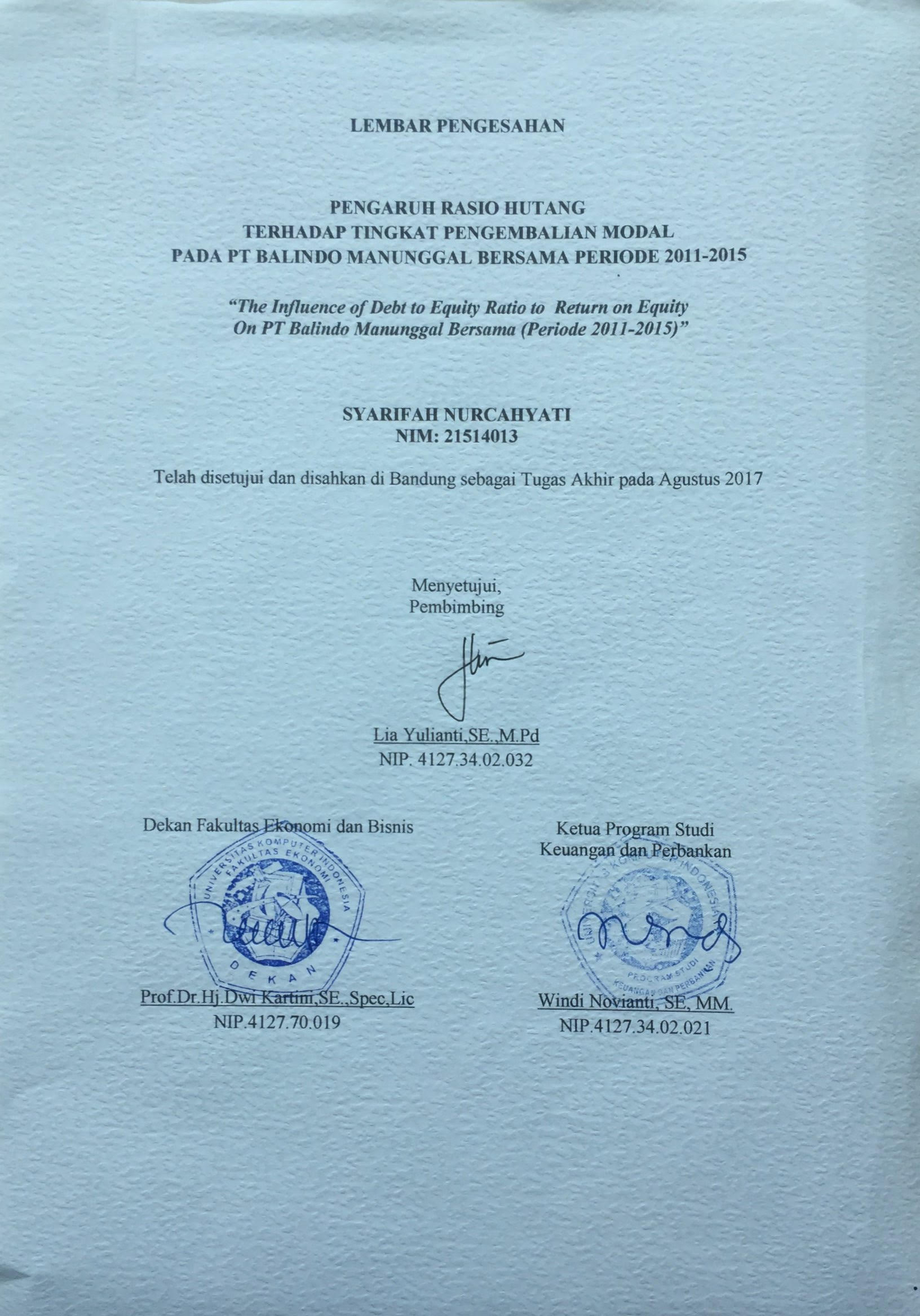 Syarifah Nurcahyati NIM. 21514013 (2017) Pengaruh Rasio Hutang Terhadap Tingkat Pengembalian Modal Pada PT. Balindo Manunggal Bersama (Periode 2011-2015).