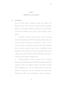 Pelaksanaan prosedur penerapan Sistem Informasi Keuangan Daerah di Bidang Keuangan SETDA Kab. Bandung sudah berjalan cukup baik sesuai dengan PP RI Nomor 56 Tahun 2005 : Pasala 1 Ayat !5, namun masih harus meningkatkan kualitas dan kinerja dalam penerapan Sistem Informasi Keuangan Daerah tersebut. Ketidaktelitian dalam penginputan menjadi penyebab hasil suatu laporan menjadi tidak maksimal sehingga akan terjadi keterlambatan dalam menghasilkan sebuah laporan keuangan mengenai anggaran di bidang tersebut. Hambatan-hambatan prosedur penerapan Sistem Informasi Keuangan Daerah Bidang Keuangan SETDA Kab. Bandung dikarenakan banyaknya transaksi yang dilakukan sehingga menyebabkan kesalahan dalam penginputan data, Hal itu membuat pekerjaan pengolah data aplikasi dan pengelolaan data sistem keuangan harus bekerja ekstra dikarenakan kesalahan pada inputan-inputan transaksi didalamnya . Sumber daya manusia yang kurang kompeten bias menjadi salah satu pemicu terjadinya kesalahan-kesalahan pada inputan transaksi tersebut sehingga menghasilkan informasi yang tidak maksimal.