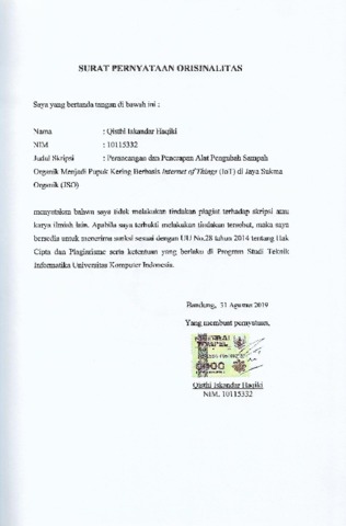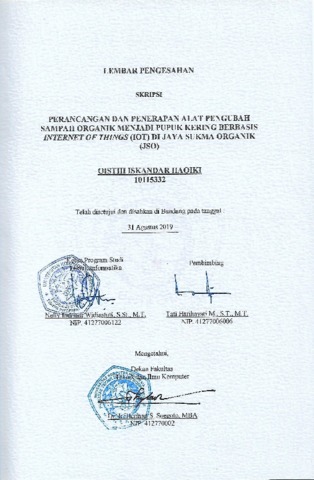Haqiki, Qisthi Iskandar (2019) Perancangan Dan Penerapan Alat Pengubah Sampah Organik Menjadi Pupuk Kering Berbasis Internet Of Things (Iot) Di Jaya Sukma Organik (Jso). Other thesis, Universitas Komputer Indonesia.