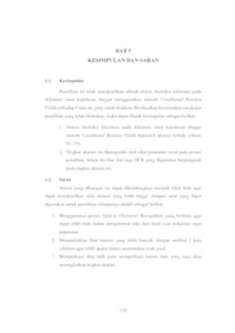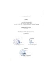 Ekstraksi Informasi merujuk pada ekstraksi otomatis dari informasi terstruktur seperti entitas, hubungan antar entitas, dan atribut deskripsi entitas dari sumber yang tidak terstruktur. Ekstraksi Informasi dilakukan dengan cara mendeteksi bagian-bagian yang ada pada suatu dokumen, salah satunya adalah dokumen Surat Keputusan. Pada penelitian ini menggunakan metode Conditional Random Fields (CRF) dengan menggunakan fitur node yang merupakan asosiasi antara data dengan label, edge yang merupakan fitur transisi dari suatu data ke data berikutnya dengan memperhatikan label. Terdapat beberapa tahapan dalam penelitian ini, yaitu preprocessing, yang meliputi filtering simbol dan tokenizing. Dilanjutkan dengan pelatihan pada CRF dengan Stochastic Gradient Method untuk mendapatkan bobot parameter. Tahap klasifikasi dilakukan dengan Viterbi Decoding untuk menentukan label paling optimal untuk data uji, dilanjutkan dengan pengujian dengan menggunakan Confusion Matrix. Penelitian ini menggunakan data latih yang didapat dari 20 dokumen surat keputusan dengan data uji yang didapat dari 6 dokumen surat keputusan. Didapat hasil akurasi tertinggi yaitu 91.73% dan akurasi terendah sebesar 77,81%. Hasil akurasi tersebut dipengaruhi oleh nilai awal bobot parameter pada tahap pelatihan.