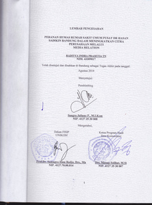 Penelitian ini bertujuan untuk mengetahui “Peranan Humas Rumah Sakit Umum Pusat Dr Hasan Sadikin Bandung Dalam meningkatkan Citra perusahaan Melalui Media Relation”. Untuk menjawab tujuan penelitian, maka peneliti mengangkat sub fokus yaitu Kegiatan, Pesan, Media dan Peranan Humas RSUP Dr hasan sadikin Bandung Dalam Meningkatkan citra perusahaan melalui media relation.Metode yang digunakan adalah penelitian deskriptif dengan pendekatan kualitatif, dimana peneliti hanya menjelaskan karakteristik dari objek yang diteliti. Teknik pengumpulan data, dilakukan oleh peneliti adalah dengan wawancara, dokumentasi, studi pustaka dan internet searching. Subyek penelitian dalam penelitian ini berjumlah dua orang. Informan dalam penelitian ini adalah Dra. Ani Mulyani dan Ekie Adrian, Amd serta informan pendukung bernama Muhammad Iqbal.Hasil penelitian diketahui bahwa kegiatan humas dalam melaksanakan kegiatan media relation untuk memberikan informasi kepada publik eksternalnya harus melalui tahap seperti konfrensi pers, press release,manfaat, tujuan, penentuan biaya. Pesan yang disampaikan melalui kegitan bersifat informatif, persuasif, dan edukatif dengan isi pesan yang singkat dan faktual serta gaya bahasa formal dengan memiliki sifat media yang bebas, dan komunikatif yang kuat patron-klien, dengan bentuk media seperti Koran, radio, dan handphone dimana semua pemilihan unsur ini bertujuan untuk mendapatkan kepercayaan publikeksternalnya. Kesimpulan dari penelitian yang telah dilakukan adalah bahwa Humas RSUP Dr. Hasan Sadikin Bandung melalui media relation dalam meningkatkan citra perusahaan menjadikan suatu program kegiatan dan aktivitas RSUP Dr. Hasan Sadikin Bandung yang dapat bejalan sesuai dengan yang diharapkan, kegiatan, pesan, dan media yang ditentukan dan berlangsung karena koordinasi dan kerjasama tim yang baik dengan semua pihak yang terkait akan berfokus pada kegiatan yang maksimal, ingin menjadikan kegiatan media relation di RSUP Dr. Hasan Sadikin Bandung sebagai media untuk menerima dan penyampaian pesan kepada wartawan dan publik. komunikasi dari dalam ke luar.Dari hasil penelitian yang telah dilakukan ada beberapa saran untuk kegiatan penyelenggaraan media relation ini yaitu mulai membina hubungan dengan media yang baru, pemilihan pesan yang bersifat informal dapat menjadi pilihan dalam kegiatan media relation, perluasan sasaran target dalam pemilihan media dan lebih diperhatikan dalam ketepatan waktu, pemilihan lokasi dan pengendalian topik dalam kegiatan media relation.