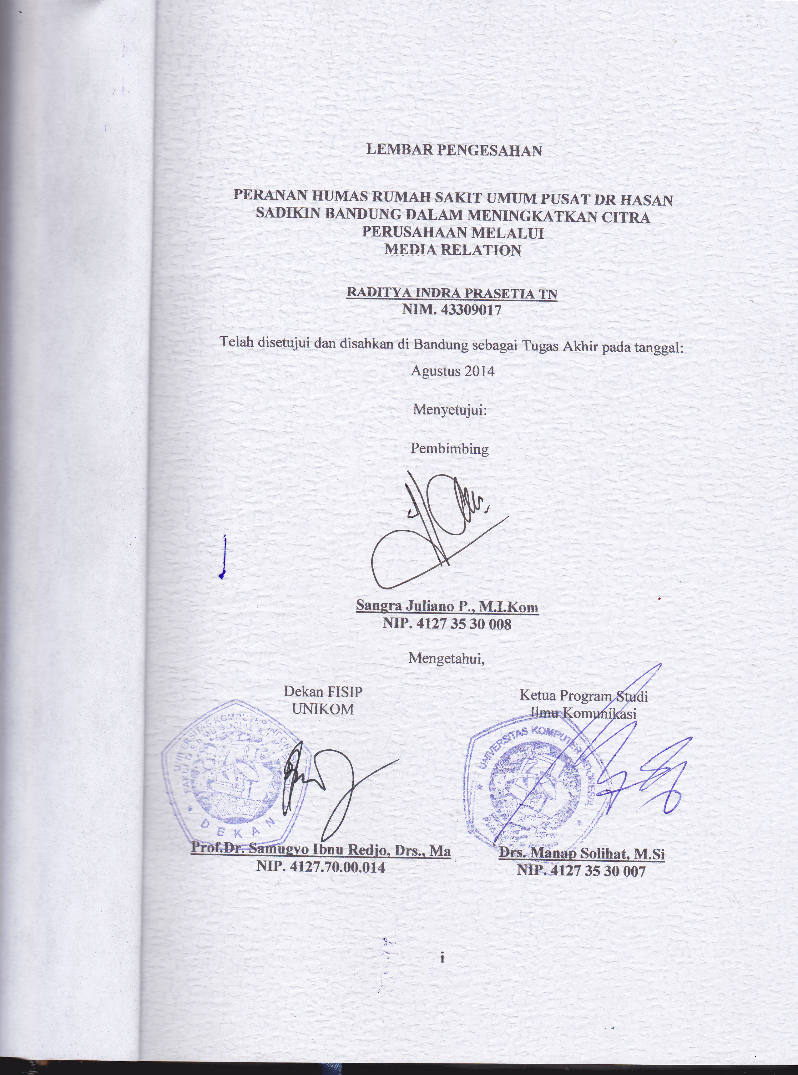 Raditya Indra Prasetia, T.N NIM.43309017 (2014) Peranan Humas RSUP dr Hasan Sadikin Bandung Dalam Meningkatkan Citra Perusahaan Melalui Media Relation.