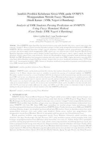 Hasil SNMPTN dapat diprediksi dari kriteria-kriteria yang sudah dimiliki oleh siswa, seperti rapor siswa dari semester 1 hingga 5. Kriteria-kriteria tersebut digunakan sebagai variabel untuk memprediksi kelulusan siswa SMK pada SNMPTN. Metode deskriptif digunakan sebagai metode penelitian, sedangkan metode pengembangan menggunakan prototype dan perancangan sistem menggunakan UML seperti use case diagram dan activity diagram. Metode Fuzzy Mamdani digunakan untuk proses analisa dengan variabel input Fuzzy yaitu rapor1, rapor2, rapor3, rapor4, dan rapor5 ditambah variabel output Fuzzy yaitu kelulusan. Sistem ini dikembangkan dengan perangkat lunak pendukung seperti MySQL dan PHP. Berdasarkan hasil pengujian terhadap data nilai rapor siswa SMK, tingkat akurasinya mencapai 82% yang dapat diklasifikasikan sebagai klasifikasi terbaik, dengan nilai precision (kedekatan perbedaan nilai) 79,55% dan nilai recall (pemanggilan kembali) 100%. Sistem ini ditujukan membantu pengambilan keputusan untuk keikutsertaan siswa SMK menjadi peserta SNMPTN.