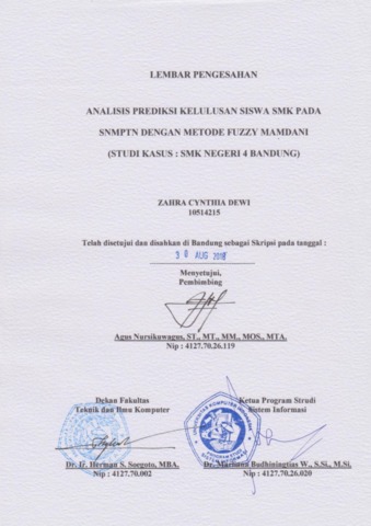 Dewi, Zahra Cynthia (2018) Analisis Prediksi Kelulusan Siswa SMK pada SNMPTN Menggunakan Metode Fuzzy Mamdani (Studi Kasus : SMK Negeri 4 Bandung). Other thesis, Universitas Komputer Indonesia.