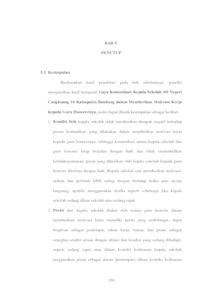 Maksud Penelitian ini untuk mengetahui dan mendeskripsikan gaya komunikasi kepala sekolah dalam memberikan motivasi kerja kepada guru honorer di SD Negeri Cangkuang 18 Kabupaten Bandung. Adapun sub fokus yang digunakan adalah kondisi fisik, peran, bahasa, hubungan dan kendala.