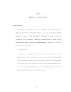 Kesimpulan penelitian yaitu Strategi Komunikasi Pemasaran Divisi Community Tokocrypto Kota Bandung melalui kegiatan cryptour untuk pembentukan brand awareness perencanaan yang digunakan yaitu tipe perencanaan subtansi dengan perencanaan ekonomi yaitu untuk membuat konsumen lebih aware lagi dan perencanaan sosial yaitu mengedukasi tentang the feature of technologi. Tujuan dari cryptour yaitu membentuk awareness dan mengedukasi tentang teknologi. Sasaran kegiatan adalah mahasiswa dan komunitas-komunitas trader di Kota Bandung. Rancangan pesan yang digunakan memberikan edukasi kepada audience tentang perkembangan teknologi atau the feaure of technologi sebelum mempromosikan perusahaan. Saluran media yaitu komuniaksi langsung melalui roadshow, meet up, dan workshop dan komuniaksi tidak langsung melalui stiker, LCD lift, dan lainnya. Evaluasi dilakukan melalui data yang diperoleh dari feedback form dan jumlah user digrup telegram pasca kegiatan cryptour.