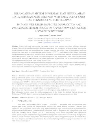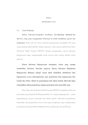 Sistem informasi kepegawaian merupakan system yang mampu membrikan infromasi data-data pegawai. Sistem informasi kepegawaian dibangun sarana agar bisa melakukan administrasi data kepegawaian dengan terkomputerisasi agar pengolahan data pegawai bisa tepat dan efisien. Saat ini pengolahan pendataan kepegawaian pada pusat sains dan teknologi nuklir terapan (PSTNT), masih kurang efektif dalam mengelolah data kepegawaian karena system yang ada hanya mendukung pengolahan data pegawai secara individu untuk setiap akun pegawai. Selain itu, untuk membantu mengelolah data kepegawaian, admn bisa dikatakan masih menggunakan Microsoft word dan excel dan proses pembukuan secara manual. Hal ini menyebabkan pendataan data kepegawaian misalnya SK tidak terekap secara digital.