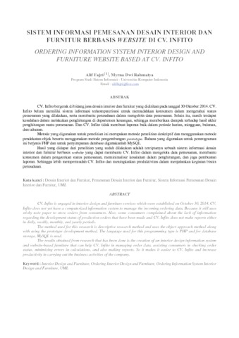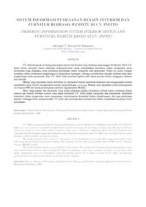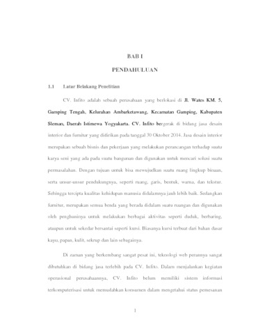 CV. Infito bergerak di bidang jasa desain interior dan furnitur yang didirikan pada tanggal 30 Oktober 2014. CV. Infito belum memiliki sistem informasi terkomputerisasi untuk memudahkan konsumen dalam mengetahui status pemesanan yang dilakukan, serta membantu perusahaan dalam mengelola data pemesanan. Selain itu, masih terdapat kesalahan dalam melakukan penghitungan di departemen keuangan, sehingga memberikan dampak terhadap hasil akhir penghitungan suatu pemesanan. Dan CV. Infito tidak membuat laporan baik dalam periode harian, mingguan, bulanan, dan tahunan.
