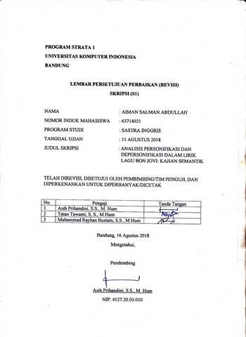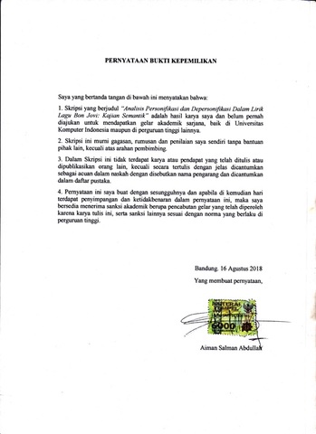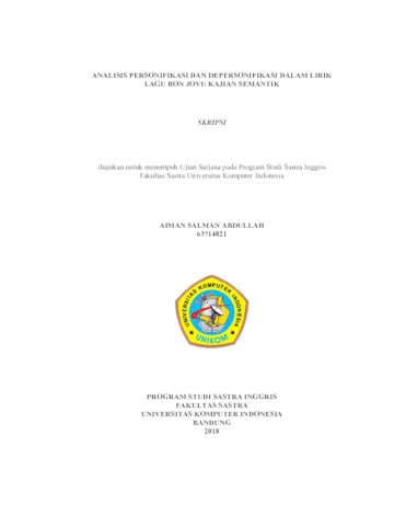 Abdullah, Aiman Salman (2018) Analisis Personifikasi Dan Depersonifikasi Dalam Lirik Lagu Bon Jovi: Kajian Semantik. Other thesis, Universitas Komputer Indonesia.