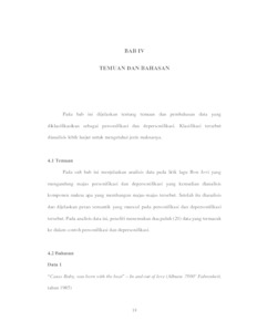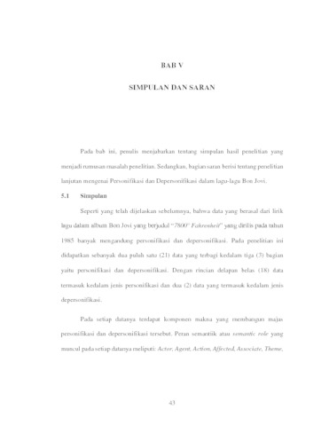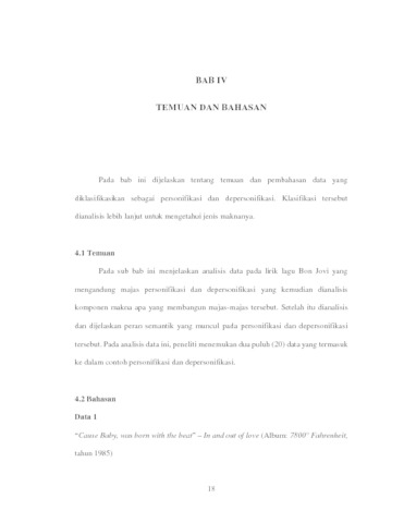 Penelitian ini berjudul “Analisis Personifikasi dan Depersonifikasi Dalam Lirik Lagu Bon Jovi: Kajian Semantik”. Penelitian ini didasarkan pada penggunaan bahasa kiasan, yakni personifikasi dan depersonifikasi yang muncul pada lirik lagu Bon Jovi yang disertai analisis mengenai jenis makna yang muncul pada data-data tersebut. Data yang diambil merupakan lirik-lirik lagu pada album kedua Bon Jovi berjudul: 7800° Fahrenheit yang dirilis tahun 1985. Total data yang didapatkan berjumlah dua puluh satu (21) data yang terbagi menjadi dua (2) bagian yaitu personifikasi sembilan belas (19) data dan depersonifikasi yang berjumlah dua (2) data. Untuk menganalisis data personifikasi dan depersonifikasi, menggunakan teori dari Keraf dan Tarigan, sedangkan teori yang digunakan untuk menganalisis komponen makna menggunakan teori dari Mildred L. Larsson dalam bukunya yang berjudul Meaning Based Translation dan teori untuk menganalisis peran semantik dari Kreidler. Metode penelitian yang digunakan adalah metode analisis deskriptif. Setelah menemukan data yang berupa personifikasi dan depersonifikasi, lalu data yang telah di temukan dianalisis dengan menggunakan komponen makna. Setelah itu data tersebut dianalisis untuk diketahui peran semantik apa yang muncul pada setiap contoh personifikasi dan depersonifikasinya.