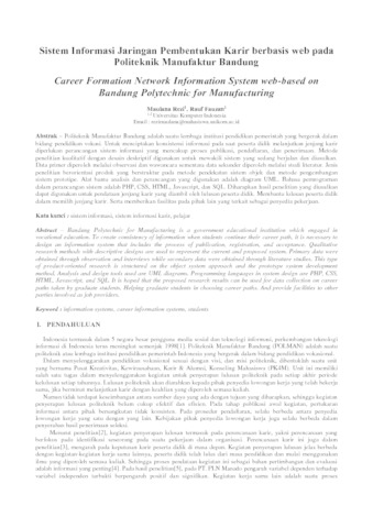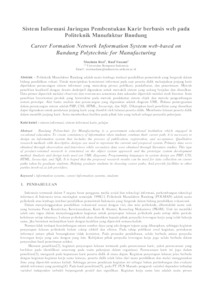 Politeknik Manufaktur Bandung adalah suatu lembaga institusi pendidikan pemerintah yang bergerak dalam bidang pendidikan vokasi. Untuk menciptakan konsistensi informasi pada saat peserta didik melanjutkan jenjang karir diperlukan perancangan sistem informasi yang mencakup proses publikasi, pendaftaran, dan penerimaan. Metode penelitian kualitatif dengan desain deskriptif digunakan untuk mewakili sistem yang sedang berjalan dan diusulkan. Data primer diperoleh melalui observasi dan wawancara sementara data sekunder diperoleh melalui studi literatur. Jenis penelitian berorientasi produk yang berstruktur pada metode pendekatan sistem objek dan metode pengembangan sistem prototipe. Alat bantu analisis dan perancangan yang digunakan adalah diagram UML. Bahasa pemrograman dalam perancangan sistem adalah PHP, CSS, HTML, Javascript, dan SQL. Diharapkan hasil penelitian yang diusulkan dapat digunakan untuk pendataan jenjang karir yang diambil oleh lulusan peserta didik. Membantu lulusan peserta didik dalam memilih jenjang karir. Serta memberikan fasilitas pada pihak lain yang terkait sebagai penyedia pekerjaan.