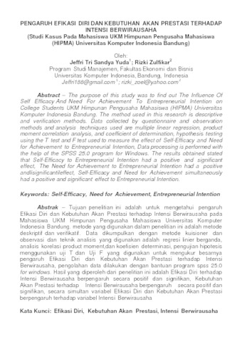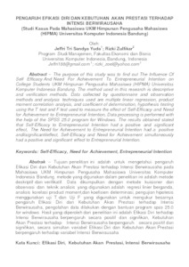 Tujuan penelitian ini adalah untuk mengetahui pengaruh Efikasi Diri dan Kebutuhan Akan Prestasi terhadap Intensi Berwirausaha pada Mahasiswa UKM Himpunan Pengusaha Mahasiswa Universitas Komputer Indonesia Bandung. metode yang digunakan dalam penelitian ini adalah metode deskriptif dan verifikatif. Data dikumpulkan dengan simetode kuisioner dan observasi dan teknik analisis yang digunakan adalah regresi ini berganda, analisis korelasi product moment,dan koefisien determinasi, pengujian hipotesis menggunakan uji T dan Uji F yang digunakan untuk mengukur besarnya pengaruh Efikasi Diri dan Kebutuhan Akan Prestasi terhadap Intensi Berwirausaha, pengolahan data dilakukan dengan bantuan program spss 25.0 for windows. Hasil yang diperoleh dari penelitian ini adalah Efikasi Diri terhadap Intensi Berwirausaha berpengaruh secara positif dan signifikan, Kebutuhan Akan Prestasi terhadap Intensi Berwirausaha berpengaruh secara positif dan signifikan, secara simultan variabel Efikasi Diri dan Kebutuhan Akan Prestasi berpengaruh terhadap variabel Intensi Berwirausaha.