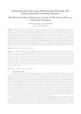 SRC (Sarana Rencana Cemerlang) Transport merupakan perusahaan di bidang jasa penyewaan mobil. Pencatatan data penyewaan, pengembalian dan transaksi di SRC Transport ini belum terkomputerisasi dan masih menggunakan cara konvensional yaitu konsumen menghubungi bagian operasional atau mendatangi tempat penyewaan mobil secara langsung untuk mendapatkan informasi mengenai penyewaan mobil dan bertransaksi. Hal ini menjadi ancaman bagi perusahaan karena saat ini sudah banyak jasa penyewaan mobil yang memanfaatkan teknologi informasi dalam meningkatkan kualitas pelayanannya dengan menggunakan website sebagai media informasi dan transaksi. Metode yang digunakan dalam penelitian ini yaitu metode pendekatan berorientasi objek dan metode pengembangan sistem adalah prototyping serta menggunakan alat bantu analisis UML (Unified Modelling Language). Penelitian ini bertujuan untuk menganalisis, merancang dan mengimplementasikan sistem informasi berbasis web pada SRC Transport yang diharapkan dapat memberikan kemudahan bagi penggunanya khususnya konsumen serta bagian operasional dalam hal pencatatan data dan pelaporan data transaksi sehingga kualitas pelayanan di perusahaan ini semakin baik dan berkembang.