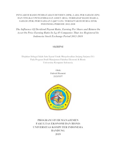 Husaeni, Fahrul (2019) Pengaruh Rasio Pembayaran Deviden, Laba Per Saham Dan Tingkat Pengembalian Aset Terhadap Rasio Harga Saham Perusahaan Lq45 Yang Terdaftar0di Bursa Efek indonesia Periode 2012-2018. Other thesis, Universitas Komputer Indonesia.