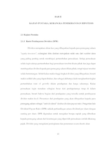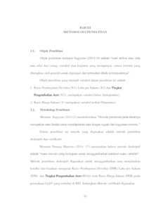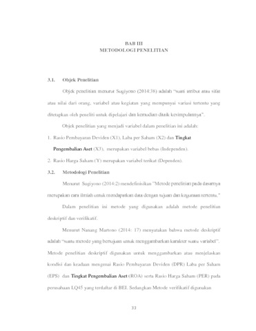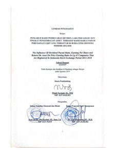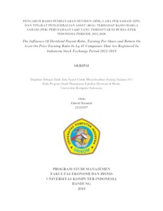 Penelitiannini bertujuann untuk mengetahui pengaruh rasio pembayaran deviden, llaba per saham dan tingkat pengembalian aset baik secara parsial maupunssimultan terhadap rasio HargaaSaham dan untuk mengetahui perkembangan masing-masing variabel pada periode 2012-2018. Metode penelitian yang digunakan adalah metode deskriptiffdan verifikatif dengan pendekatan kuantitatif. Sedangkanndata yang diigunakan adalah data sekunderr yang meliputi data rasio pembayaran deviden, llaba per saham, tingkatt pengembalian aset dan rasio hargaa saham. Teknik pengambilan sampel dengan metode purposive sampling. Berdasarkan kriteria yang ada, diperoleh 5 perusahaan LQ 45 yang menjadii sampellpenelitian.rRancangan analisis yang digunakanaadalah analisis regresiiberganda, analisis koefisien korelasi, danaanalisis koefisien determinasi, sedangkan pengujianhhipotesis menggunakan ujiiT dan ujiiF. Hasil penelitian menunjukan bahwa secara parsial Rasio Pembayaran Deviden berpengaruhhtidak signifikan terhadap RasiooHargai Saham. Laba per saham berpengaruh itidak signifikan terhadapi Rasio HargaiSaham. Tingkat pengembalian aset berpengaruh dan signifikan terhadap Rasio iHarga Saham. Dan secara simultan Rasio Pembayaran Deviden, LabaaPer Saham dannTingkat PengembaliannAset menunjukkan hasil yang berpengaruh terhadap Rasio HargaaSaham.