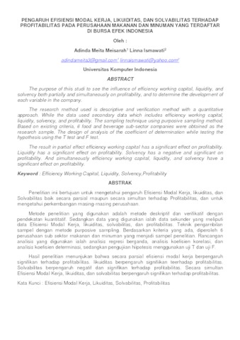 Meisarah, Adinda Meita (2019) Pengaruh Efisiensi Modal Kerja, Likuiditas, Dan Solvabilitas Terhadap Profitabilitas Pada Perusahaan Makanan Dan Minuman Yang Terdaftar Di Bursa Efek Indonesia (BEI) Periode 2013-2017. Other thesis, Universitas Komputer Indonesia.