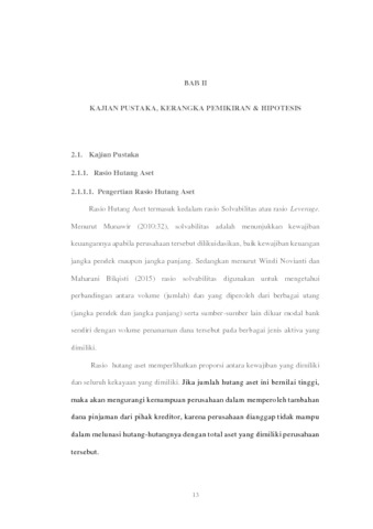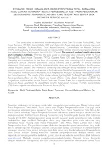 Penelitian dilakukan ini bertujuan untuk lebih mengetahui perkembangan Rasio Hutang Aset, Rasio Perputaran Total Aktiva, Rasio Lancar dan Tingkat Pengembalian Aset. Dan juga untuk menganalisa seberapa besar pengaruh Rasio Hutang Aset, Rasio Perputaran Total Aktiva dan Rasio Lancar terhadap Tingkat Pengembalian Aset baikjsecara parsiaI maupun secara simuItan pada perusahaan Sektor Industri Barang Konsumsi yang Terdaftar pada Bursa Efek Indonesia Periode 2013-2017. Metode penelitian yang peneliti gunakan pada penelitian ini yaitu metode deskriptif dan juga overifikatif. Sedangkan data yang digunakan yaitu data sekunder yang mencakup Rasio Hutang Aset, Rasio Perputaran Total Aktiva, Rasio Lancar dan Tingkat Pengembalian Aset. Pengambilan sampel dilakukan berupa data panel perusahaan yang terdiri dari 6 sampel laporan keuangan tahunan perusahaan (cross section)idan 5 periodeilaporan keuangan tahunan (time series) sehingga total data panel yang diambil sebanyak 30 pooled data pada Sektor Industri Barang Konsumsi. Metode pengumpulanidata didapat melalui studi kepustakaan berupa penelitian terdahulu, jurnal, dan akses website resmi Bursa Efek Indonesia www.idx.co.id. Metodel analisis yang digunakan adalah Analisis Regresii Linear Berganda dengan melakukan Uji-ti(parsial) dan Uji-f (simultan).Hasil penelitian menunjukan bahwa Rasio Hutang Aset secara parsial berpengaruh signifikan terhadap Tingkat Pengembalian Aset, Rasio Perputaran Total Aktiva berpengaruh positif signifikan terhadap Tingkat Pengembalian Aset, Rasio Lancar berpengaruh signifikan terhadap Tingkat Pengembalian Aset, dan Rasio Hutang, Rasio Perputaran Total Aktiva, dan Rasio Lancar berpengaruh signifikan terhadap Tingkatt PengembaIian Aset.