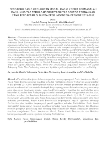 Kusumah, Hanifah Dianny (2019) Pengaruh Rasio Kecukupan Modal, Rasio Kredit Bermasalah Dan Likuiditas Terhadap Profitabilitas Sektor Perbankan Yang Terdaftar Di Bursa Efek Indonesia Periode 2013-2017. Other thesis, Universitas Komputer Indonesia.