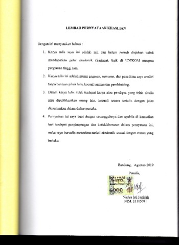 UNIKOM_NADYA ISTI FARIDAH_3.LEMBAR KEASLIAN.pdf - Published Version