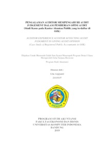 Argiyanti, Gita (2019) Pengalaman Auditor Mempengaruhi Audit Judgement Dalam Pemberian Opini Audit (Studi Kasus Pada Kantor Akuntan Publik Yang Terdaftar Di Ojk). Other thesis, Universitas Komputer Indonesia.