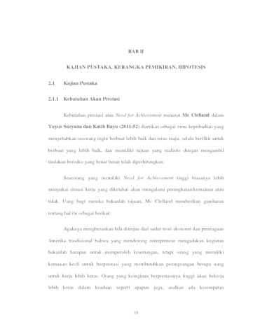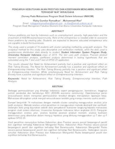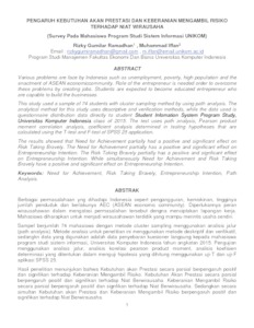 Hasil penelitian menunjukan bahwa Kebutuhan akan Prestasi secara parsial berpengaruh positif dan signifikan terhadap Keberanian Mengambil Risiko. Kebutuhan akan Prestasi secara parsial berpengaruh positif dan signifikan terhadap Niat Berwirausaha. Keberanian Mengambil Risiko secara parsial berpengaruh positif dan signifikan terhadap Niat Berwirausaha. Sedangkan secara simultan Kebutuhan akan Prestasi dan Keberanian Mengambil Risiko berpengaruh positif dan signifikan terhadap Niat Berwirausaha.