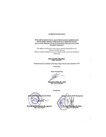 Ramadhan, Rizky Gumilar (2019) Pengaruh Kebutuhan Akan Prestasi Dan Keberanian Mengambil Risiko Terhadap Niat Wirausaha (Survey Pada Mahasiswa Program Studi Sistem Informasi UNIKOM). Other thesis, Universitas Komputer Indonesia.