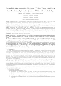 Tujuan penelitian ini memberikan solusi berupa sistem informasi monitoring sales pada PT. Sinar Timur Abadi Raya dari permasalahan yang didapat untuk membantu sekaligus mempermudah dalam kegiatan penjualan.Metode penelitian menggunakan teknik wawancara dan observasi. Dalam konsep perancangan sistem ini menggunakan pendekatan berorientasi objek, alat bantu analisis pemodelan menggunakan UML serta bahasa program perancangan menggunakan PHP. Metode pengembangan yang dipakai menggunakan prototype. Masalah yang didapat dari penelitian ini antara lain : manualnya monitoring sales sehingga terjadi kerugian bagi perusahaan. Maka dari itu saran yang diberikan diantaranya: 1) Sistem informasi dapat dikembangkan untuk memenuhi kebutuhan penjualan di PT. Sinar Timur Abadi Raya 2) Kedepannya dapat mempunyai sistem informasi geografis untuk pemantauan lebih lanjut, 3) Diharapkan dapat memenuhi proses pengolahan data di level principle, grosir, star outlet dan retail.