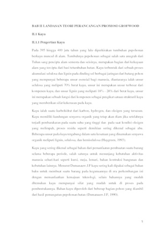 Kayu merupakan kekayaan alam yang tercipta dari proses terbentuknya akumulasi selulosa dan lignin pada dinding sel berbagai jaringan dari batang. Bahan material kayu biasanya didapat dari hasil pemungutan pepohonan hutan, yang dipilih hanya bagian yang dapat dimanfaatkan untuk dijadikan suatu barang atau produk yang bernilai jual. Olahan kayu banyak dipergunakan sebagai bahan dasar dari pembuatan meja, kursi, lemari, dan kebutuhan seni sebagai penunjang dan pelengkap sebuah ruangan. Saat ini di Indonesia khususnya di Kota Bandung sudah banyak bermunculan pengrajin kayu dari keterampilan tangan dan kreativitasnya masing-masing untuk dapat mengolahnya menjadi sebuah produk yang bernilai jual. Seiring perkembangan olahan kayu dianggap menjadi kebutuhan sekunder dibeberapa kalangan masyarakat umum. Salah satunya olahan dari kayu pinus yang diminati oleh masyarakat umum, biasanya untuk kebutuhan interior, furniture, packaging, aksesori, dan kebutuhan lainnya. Dalam keunggulan Grofwood saat ini belum begitu dikenal oleh masyarakat luas, karena belum optimalnya dalam melakukan promosi pemasaran untuk dapat mencakup pada kebutuhan masyarakat. Maka dari itu Grofwood perlu melakukan promosi yang tepat untuk mengenalkan brand image Grofwood pada masyarakat.