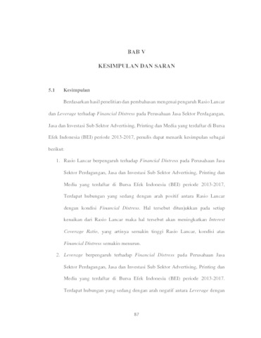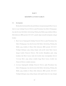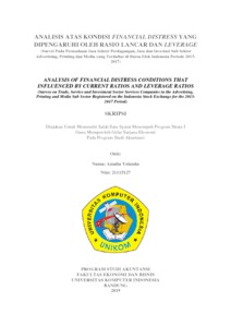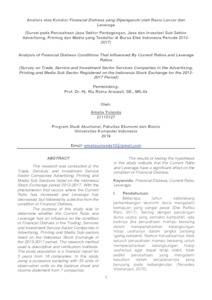 Tujuan penelitian adalah untuk mengetahui apakah Rasio Lancar dan Leverage memiliki pengaruh terhadap kondisi Financial Distress pada Perusahaan Jasa Sektor Perdagangan, Jasa dan Investasi Sub Sektor Advertising, Printing dan Media yang terdaftar pada Bursa Efek Indonesia pada periode 2013-2017. Metode penelitian yang digunakan adalah metode deskriptif dan verifikatif. Populasi penelitian adalah laporan keuangan selama 5 tahun dari 18 perusahaan. Pada penelitian ini menggunakan sampel purposive sampling dengan unit observasi pada neraca dan laporan laba rugi sebanyak 35 sampel dari 7 perusahaan. Teknik analisis data yang digunakan dalam penelitian ini adalah SPSS dengan software SPSS V.21.