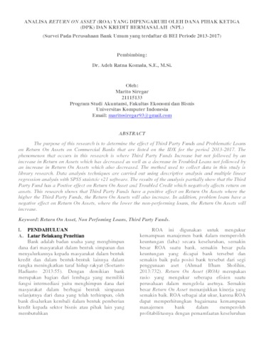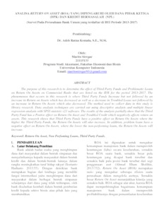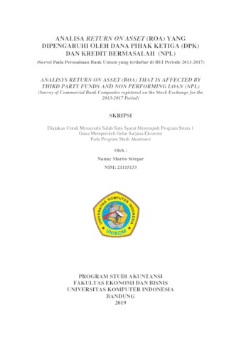 Siregar, Marito (2019) Analisa Return On Asset (Roa) Yang Dipengaruhi Oleh Dana Pihak Ketiga (Dpk) Dan Kredit Bermasalah (Npl) (Survei Pada Perusahaan Bank Umum yang terdaftar di BEI Periode 2013-2017). Other thesis, Universitas Komputer Indonesia.
