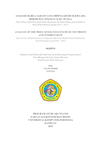 Holilah, Lela Siti (2019) Analisis Harga Saham Yang Dipengaruhi Oleh Laba Bersih Dan Tingkat Suku Bunga (Survei Kasus pada Perusahaan Sektor Keuangan Sub Sektor Bank yang Terdaftar di Bursa Efek Indonesia periode 2013 – 2017). Other thesis, Universitas Komputer Indonesia.