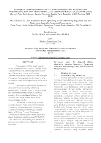 Fitri, Regina Ramadhani (2019) Pengaruh Loan To Deposit Ratio (Ldr), Biaya Operasional Pendapatan Operasional (Bopo) Dan Non Performing Loan (Npl) Terhadap Kinerja Keuangan (Roa) (Survei Penelitian Pada Bank Umum Swasta Nasional Devisa Yang Terdaftar Di Bursa Efek Indonesia Tahun 2014-2018). Other thesis, Universitas Komputer Indonesia.