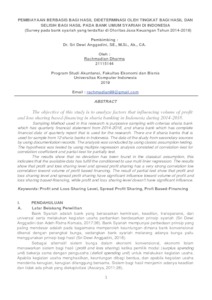 Tujuan dari penelitian ini adalah untuk menganalisis faktor-faktor yang mempengaruhi volume pembiayaan berbasis bagi hasil pada bank syariah di Indonesia selama kurun waktu 2014-2018. Teknik Sampling yang digunakan adalah purposive sampling dengan kriteria bank umum syariah yang memiliki laporan keuangan publikasi triwulan selama periode 2014-2018 dan bank umum syariah yang memiliki data keuangan publikasi triwulan yang lengkap sesuai yang dibutuhkan dalam penelitian. Diperoleh jumlah sampel sebanyak 6 bank umum syariah dari 12 bank umum syariah yang terdaftar di Otoritas Jasa Keuangan Indonesia. Data yang digunakan berjenis sekunder yang dikumpulkan dengan metode dokumentasi. Analisis pengujian data pada penelitian ini menggunakan uji asusmsi klasik. Metode pengujian hipotesis yang digunakan adalah regresi linier berganda yang terdiri dari uji Korelasi untuk menguji koefisien korelasi dan uji parsial untuk menguji regresi parsial.